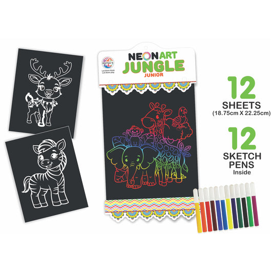 Ratna's Neon Art Jungle Junior Creative Coloring Kit with 12 Sheets (18.75 X 22.25 cm) and 12 Sketch Pens - Creative Coloring Fun for All Ages