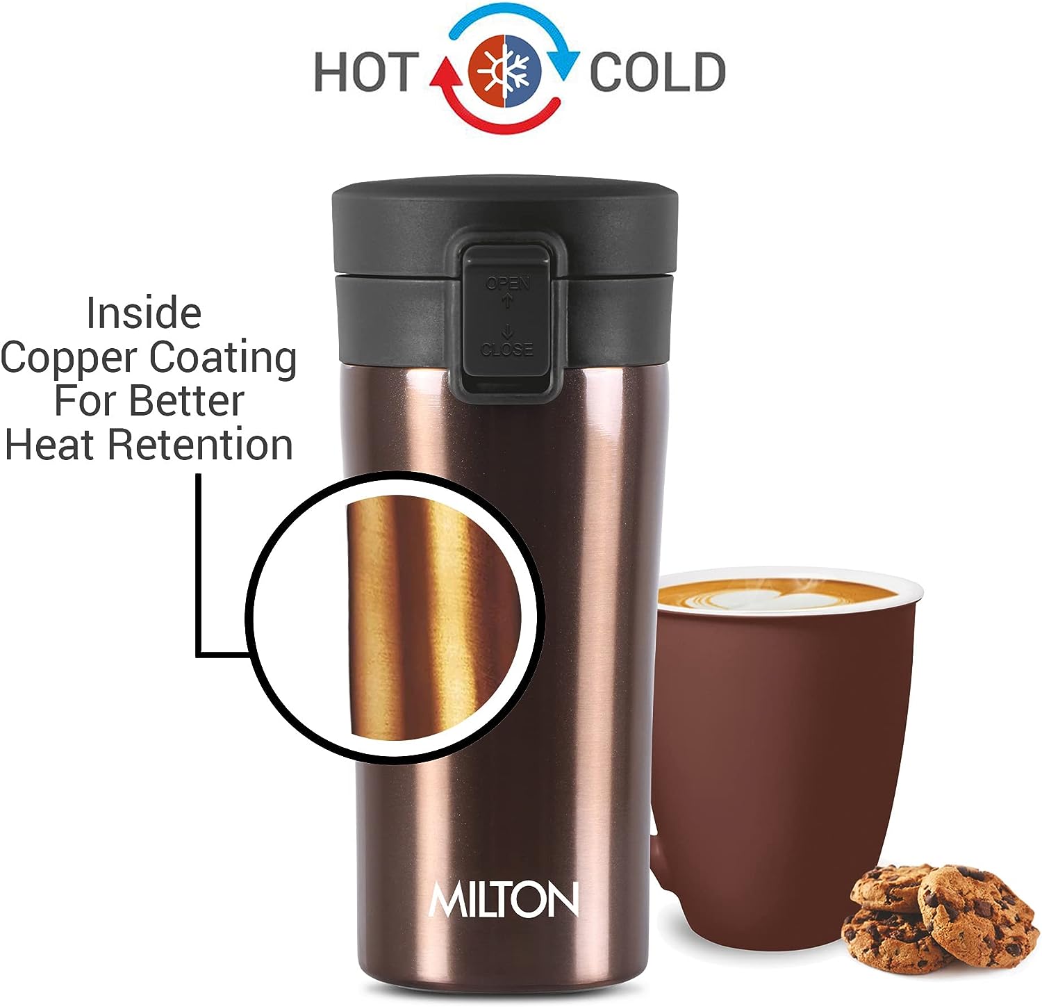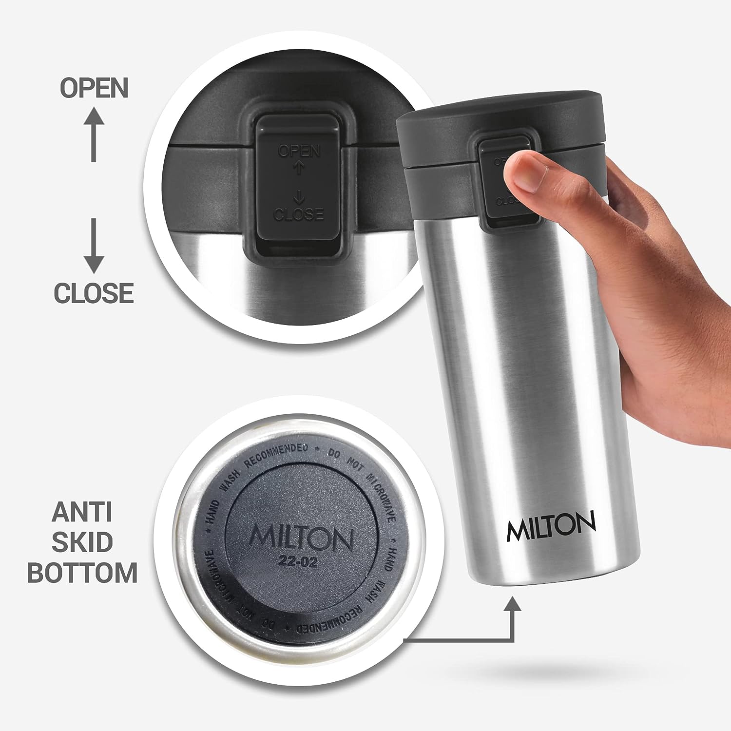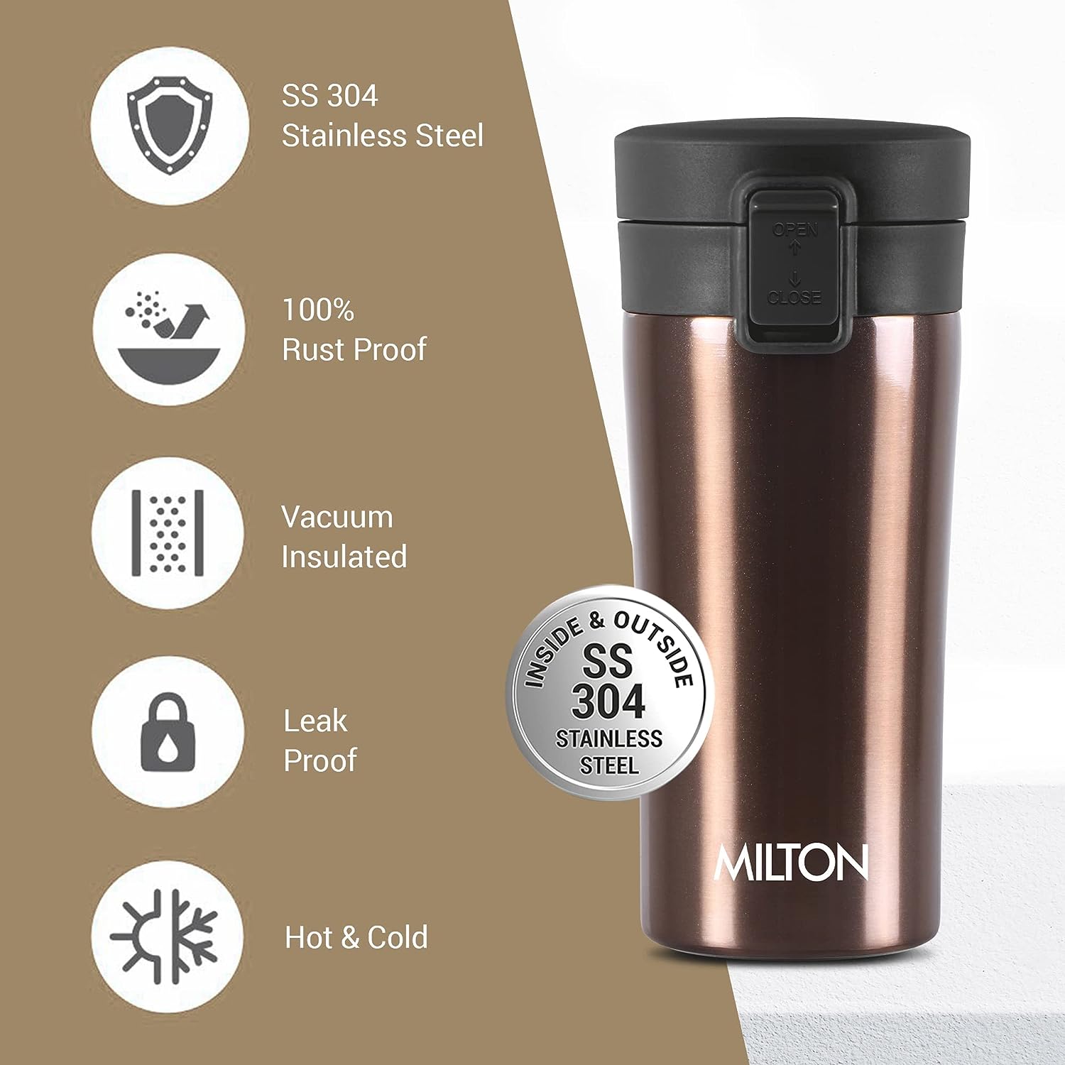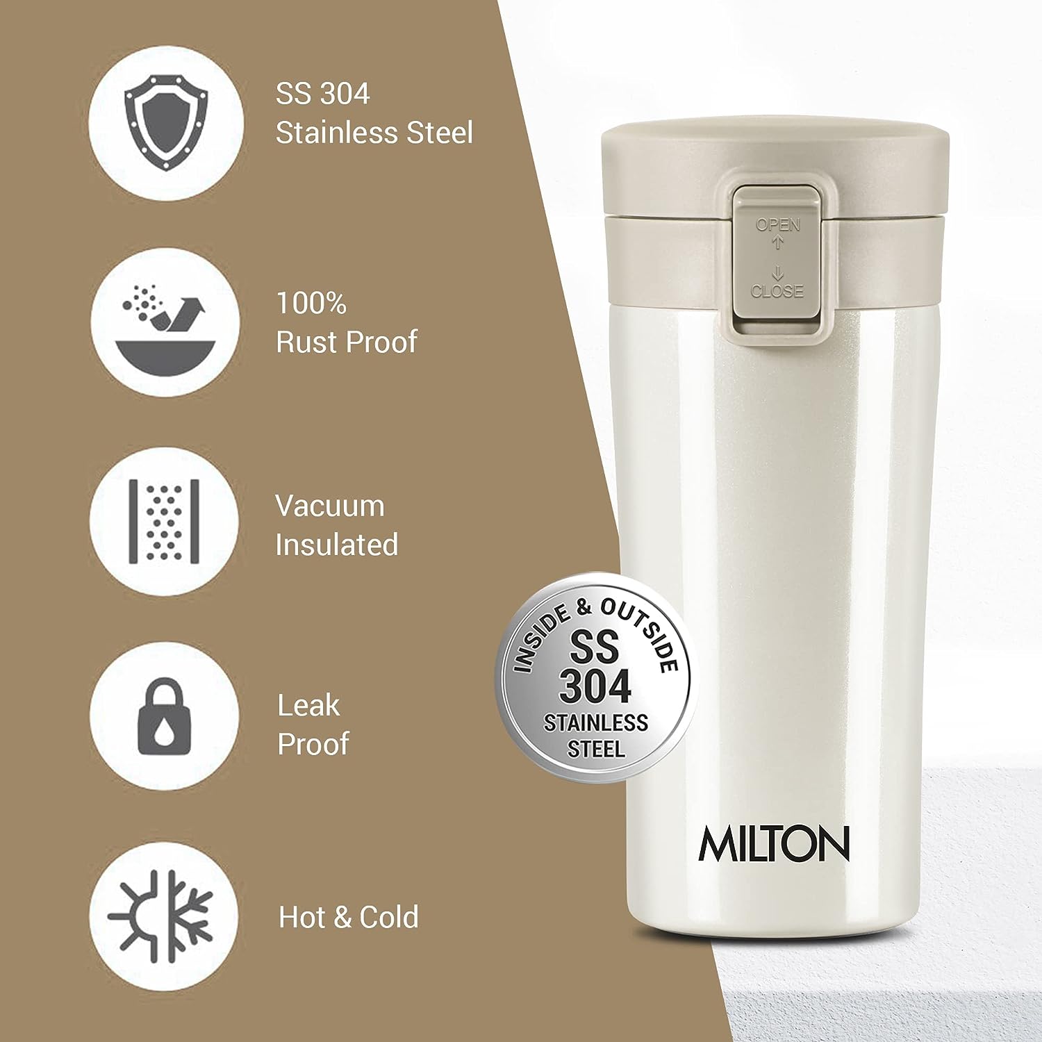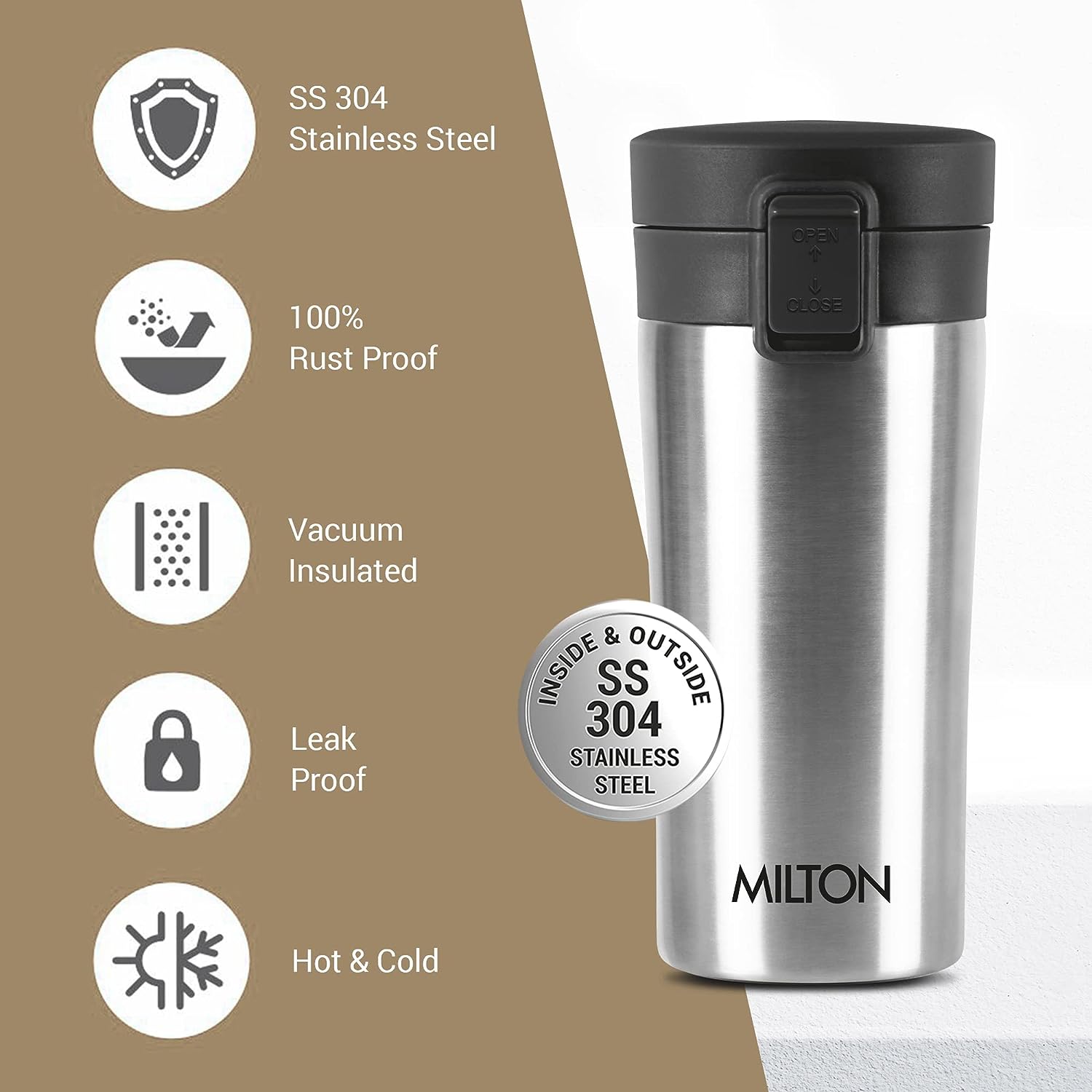- Milton Thermosteel Insulated Coffee Mug is a leak-proof and durable flask made of stainless steel.