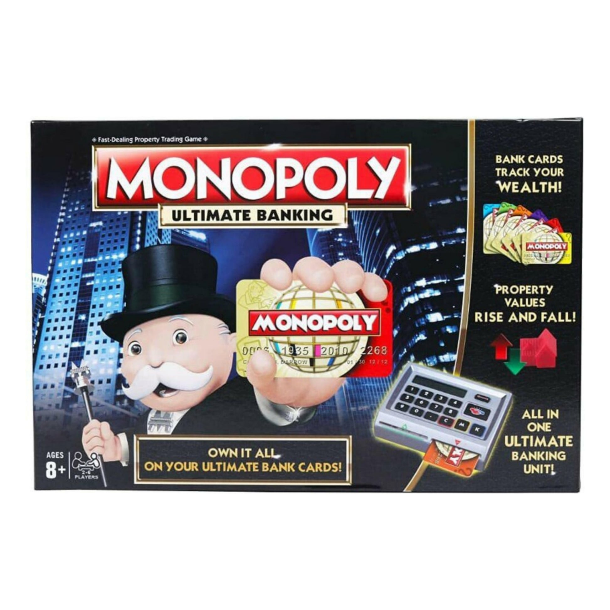 Introducing a modern banking version of the Monopoly game: the Ultimate Banking Edition. In this edition, Monopoly money is no more! The Monopoly Ultimate Banking game features an all-in-one Ultimate Banking unit with touch technology that makes the game fast and fun. Now players can instantly buy properties, set rent, and tap their way to fortune. Each player gets a bankcard and the Ultimate Banking unit keeps track of everyone's fortunes. It also scans the game's property cards and can boost or crash the market. Traditional Monopoly play gets amped up with this edition -- the game introduces Event cards and Location spaces instead of Chance cards and Community Chest cards. Land on an Event Space, and rents may be raised or lowered, a player may earn or lose money, or someone could get sent to Jail. Location Spaces allow players to pay and move to any property space on the gameboard. Challenge friends and family to win it all with the Monopoly Ultimate Banking game! Includes 1 gameboard, 1 Ultimate Banking unit, 4 plastic tokens, 22 houses, 49 cards [4 Bank, 22 Title Deed, 23 Event">, 2 dice, and game guide.