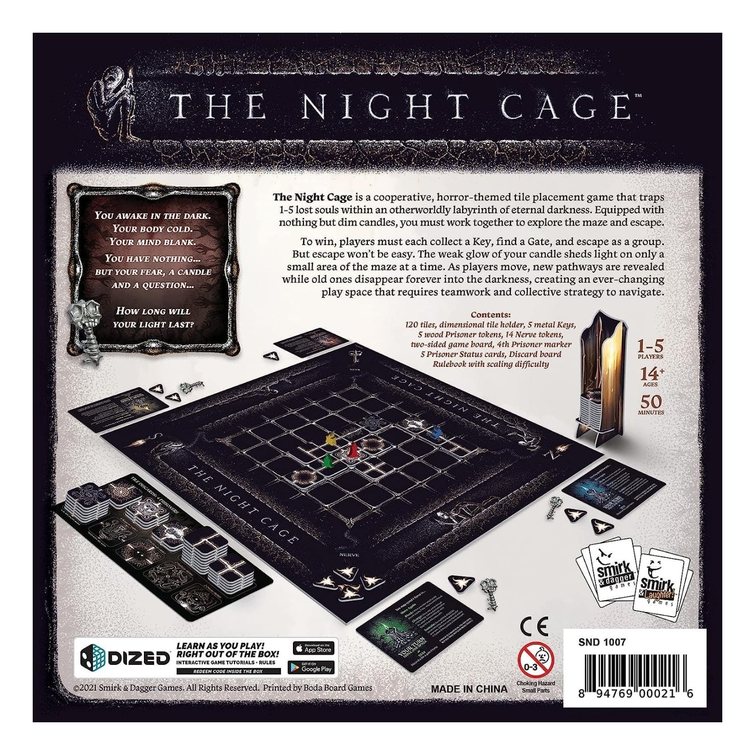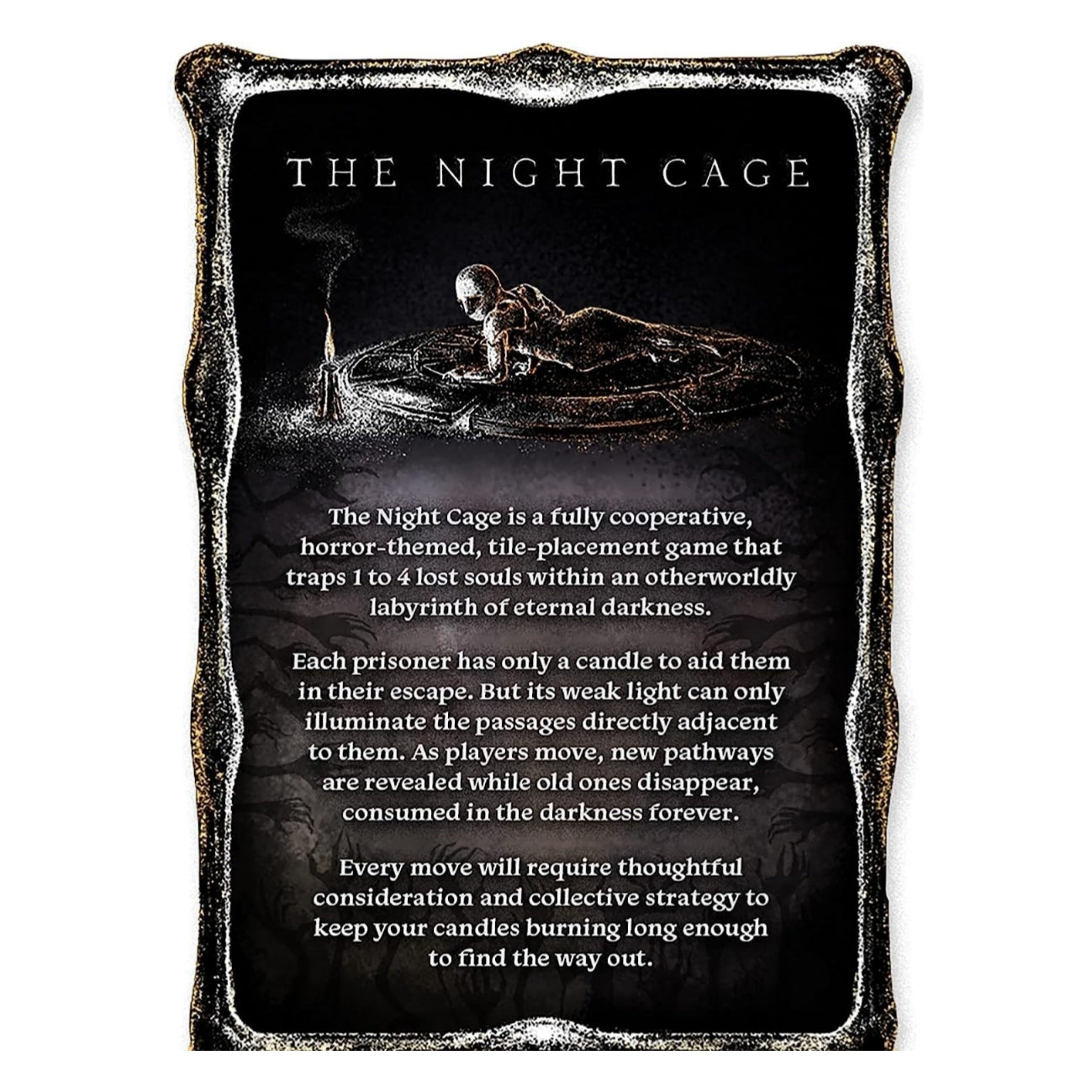 You awaken in the suffocating darkness, your mind blank and your only companion a flickering candle. In "The Night Cage," you and up to four others are trapped in an eerie underground maze, forced to work together to escape its shifting paths and relentless Wax Eaters. This fully cooperative, horror-themed game delivers an immersive tile-laying experience, where players must collect keys, find an exit gate, and escape as a group. The catch? The dim light of your candles illuminates only adjacent tiles, and paths left behind are swallowed by darkness. Every move reshapes the maze, increasing tension and demanding clever strategy. With intuitive rules that can be taught in minutes, "The Night Cage" is accessible to newcomers while offering depth and challenge for experienced gamers. Its unique mechanics and thematic design create a fast-paced, edge-of-your-seat experience that’s perfect for game night. Adjustable difficulty levels and an Advanced Game mode keep the thrills alive for endless replayability. Will your candle burn long enough to light the way out, or will the darkness claim you? Key Features: 1-5 players Ages 14+ 40-60 minutes of playtime Includes advanced game challenges Package Includes: 1 Game Board 1 Set of Tiles Player Tokens Rulebook Add "The Night Cage" to your collection today and bring the thrill of cooperative horror to your next game night!